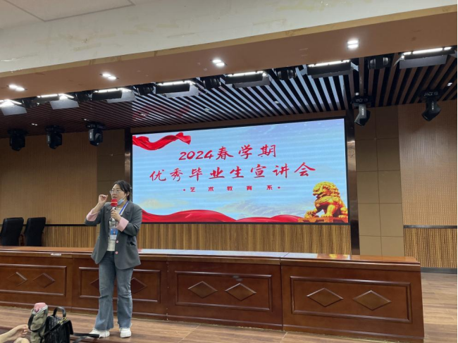 耕耘更知韶光贵,不待扬鞭自奔蹄。为进一步加强学风建设,发挥先进个人榜样示范作用,引导青年学生做好对未来的学业规划和职业生涯规划,2024年4月23日、27日晚上,艺术教育系在综合楼7楼报告厅分两场开展了“逐榜样之光,汲奋进力量”优秀毕业生宣讲会。本次宣讲会邀请了艺术教育系16级毕业生丁韩,17级毕业生孙思梦,18级毕业生张迎寒,19级毕业生李梦琪、孟薇传授学习方法和工作经验。会议由刘欣老师主持,艺术教育系主任郭锐、团总支书记雷雅鸣出席会议,班主任及学生代表参会。