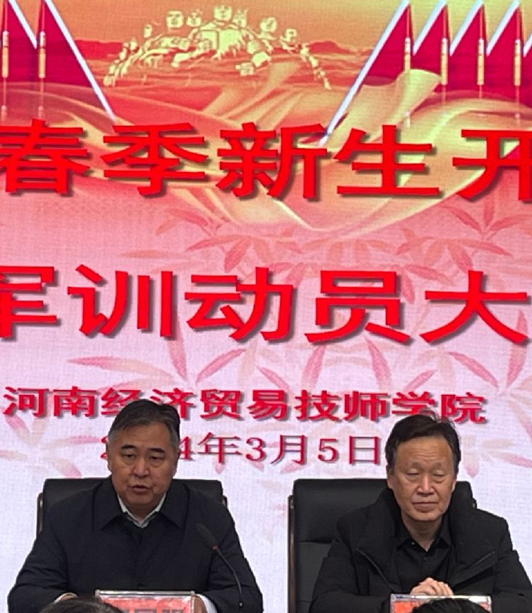 3月5日上午,河南经济贸易技师学院2024年春季新生开学典礼暨军训动员大会在学院14号楼报告厅隆重举行。出席本次军训开幕仪式的领导有学院党委书记郭国强,学院党委副书记、纪委书记张志杰,学院党委委员、副校长路全新,学院党委委员、副校长梁文波。各系主任、党支部书记,教务处、学生处、院团委主要负责人参加了本次动员大会。