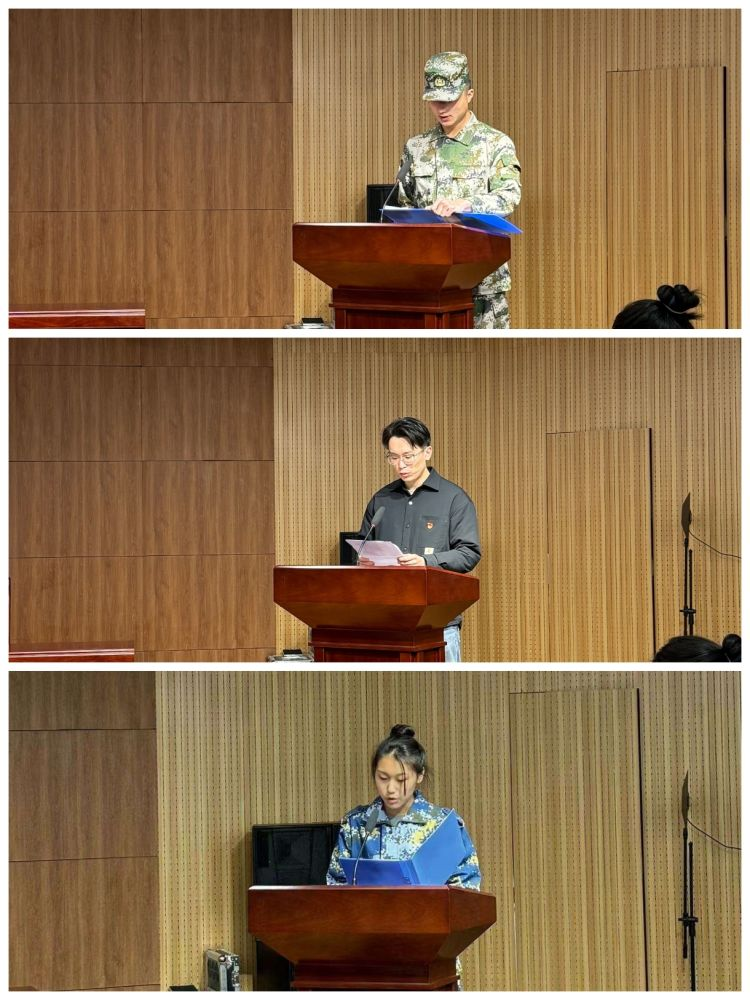 班主任代表刘源老师发言,教官代表杨博发言,新生代表王梦美雪发言。