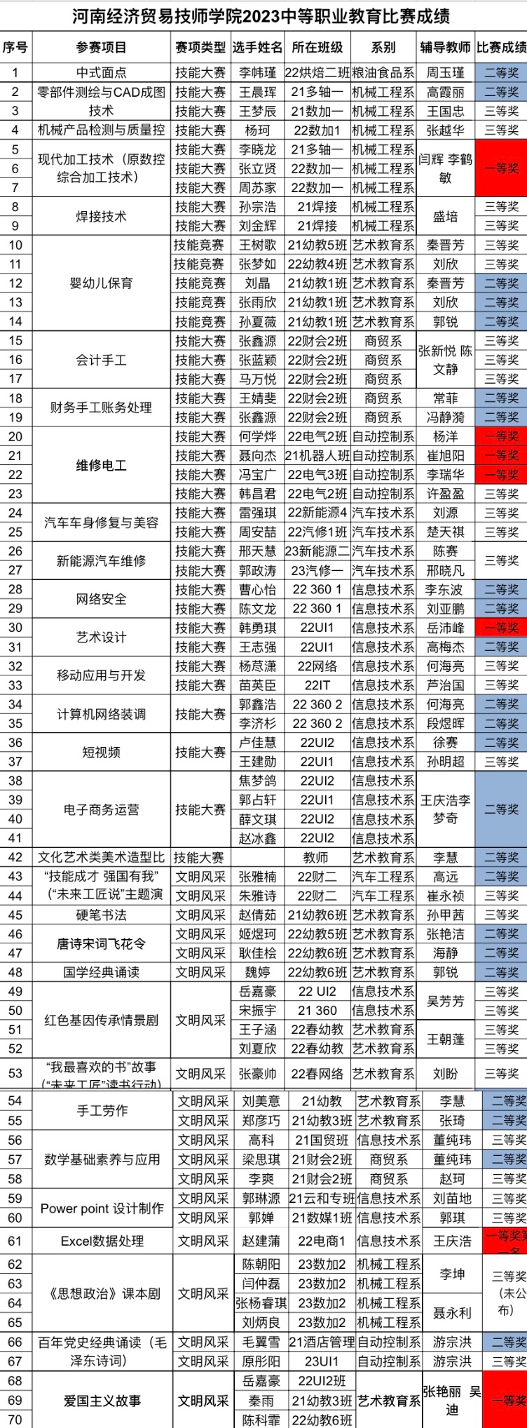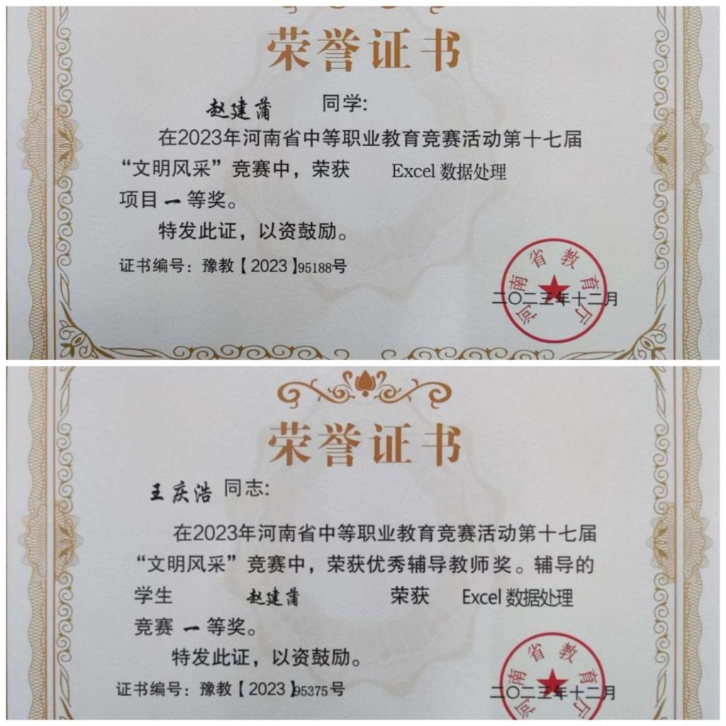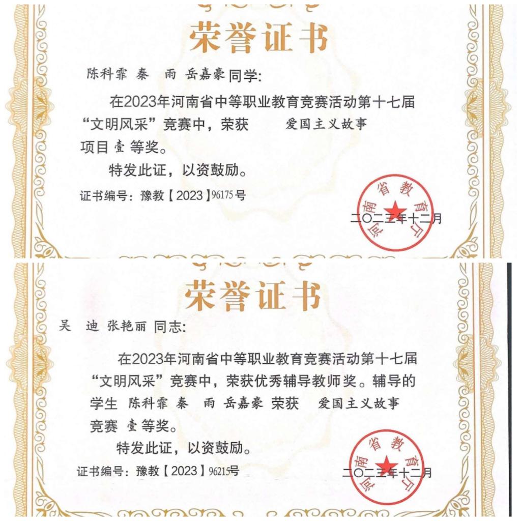 由河南省教育厅主办的2023年河南省中等职业教育竞赛活动于12月份已经结束,此次竞赛分为教育技能大赛和“文明风采”竞赛,学院共派出86名师生参加34个赛项的比赛,11人获5个赛项一等奖,26人获23个赛项二等奖,33人获19个项目三等奖,共70人获奖。