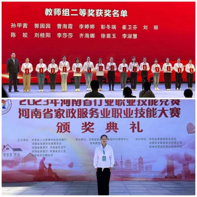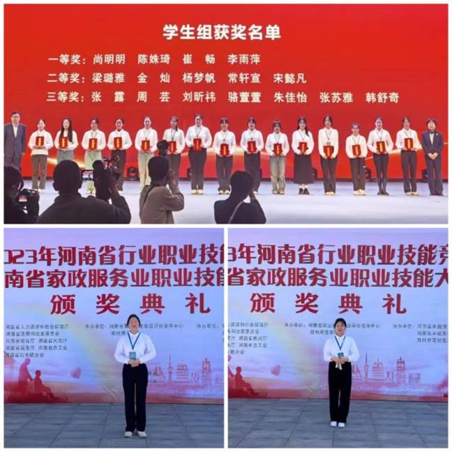 在2023年11月4日-6日举行的河南省家政服务业职业技能大赛中,艺术教育系参赛师生全力以赴,奋勇向前,两名学生荣获育婴员和保育师项目学生组第一名省一等奖,育婴员项目获教师组二等奖。