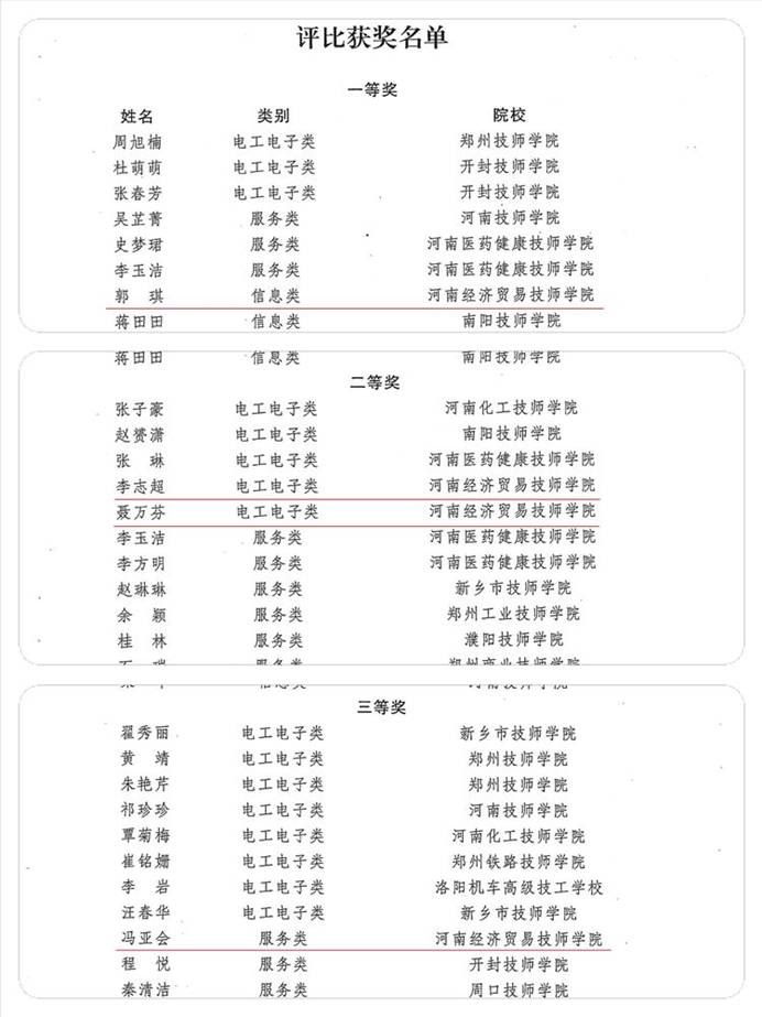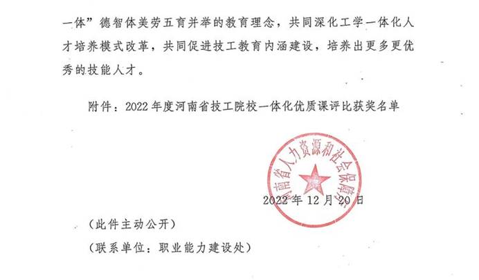 近日,2022年度河南省技工院校一体化优质课评比落下帷幕,我院四名参赛教师全部获奖:省一等奖1人、二等奖2人、三等奖1人!为学院2022年竞赛工作画上了圆满的句号。