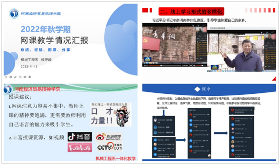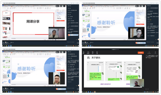 机械工程系教师苏蒙、李坤、孙青、侯守峰四位老师分享了线上教学的经验。从课前准备、德育融入、提高上课出勤率、调动学生课堂互动积极性、督促学生认真完成作业、家校携手共同育人等多个方面进行分享。
