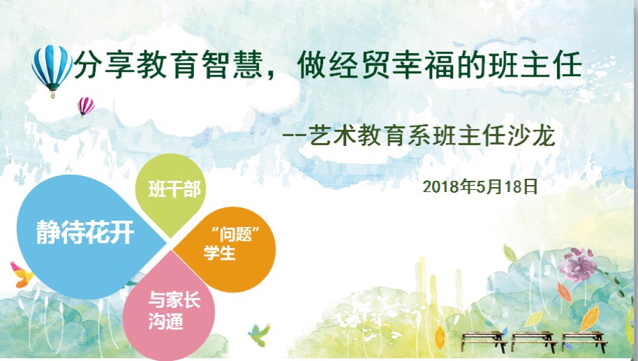 本次班主任沙龙,参与分享的课题分别是郭然老师《如何打造优秀的班干部团队》、刘盼老师《与问题学生过招》、孙甲茜老师《如何与家长沟通》、朱黎老师《诚信永伴我成长》和王朝蓬老师《用心守候,静待花开》。