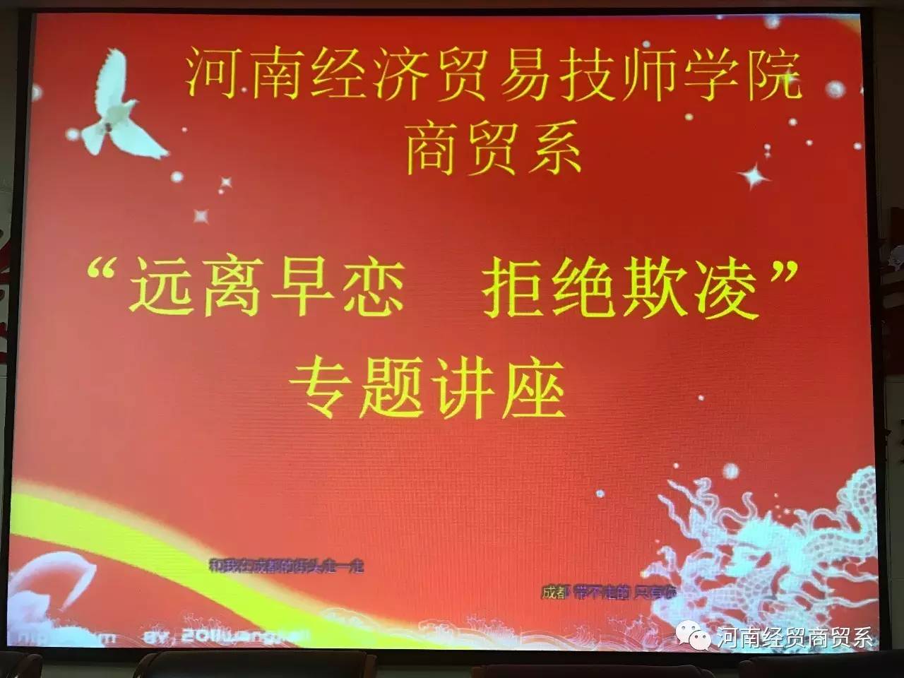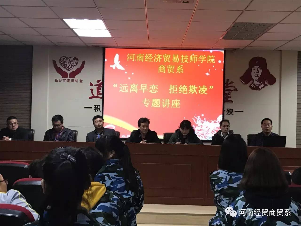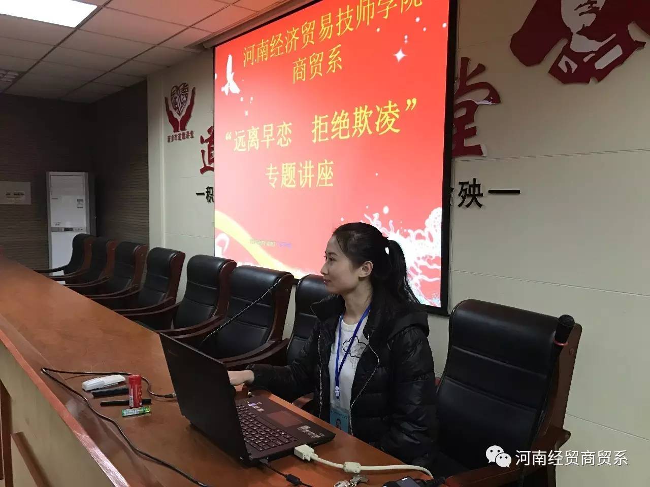 3月30日晚上7:30商贸系全力打造的法律知识进校园系列专题讲座全面展开,本期讲座的主题为“远离早恋,拒绝欺凌”。本次讲座由毕业于河南大学法学专业,兼修心理学专业,曾在多个律师事务所工作的商贸系教师冯亚会主讲。出席本次讲座的有我校主管学生工作的副校长张志杰老师、团委书记郭锐老师、学生科副科长孙树明老师、机械加工系书记朱聪辉老师、商贸系主任苗瑞红老师、商贸系副主任刘学昌老师、商贸系书记李毅老师以及商贸系全体班主任老师。商贸系陈梦诗老师担任本次讲座的主持。