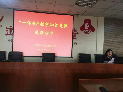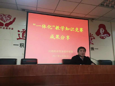 寒假期间,苏校长和督导科的老师们认真评阅大家的试卷,最终评出一等奖8人,二等奖24人,三等奖31人,并于2017年2月24日下午,再次组织召开了全体专兼职教师大会。荣获一等奖的于淼老师、王慧玲老师和刘蕾老师三人分享了他们的”一体化”教学实践的体会和收获。苏校长对前期我院教师对一体化理论知识的学习予以肯定,并对知识竞赛中的获奖老师表示了祝贺和鼓励,最后提出我院2017年教学工作的总体目标是:继续深化“创新升级”活动,持续深化“校企合作”,全面推进“一体化”教学改革,不断增强学校发展内涵,促进学生高质量就业。