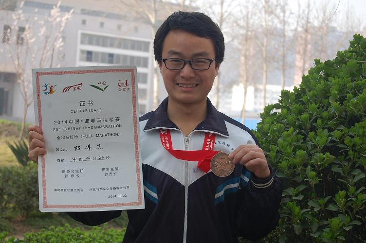 2014年3月2日,我校11级财会升学班银伟杰同学以4小时22秒跑完了河北邯郸全程马拉松42公里195米(我们跑操的大圈90圈)。我们都该为他感到骄傲。