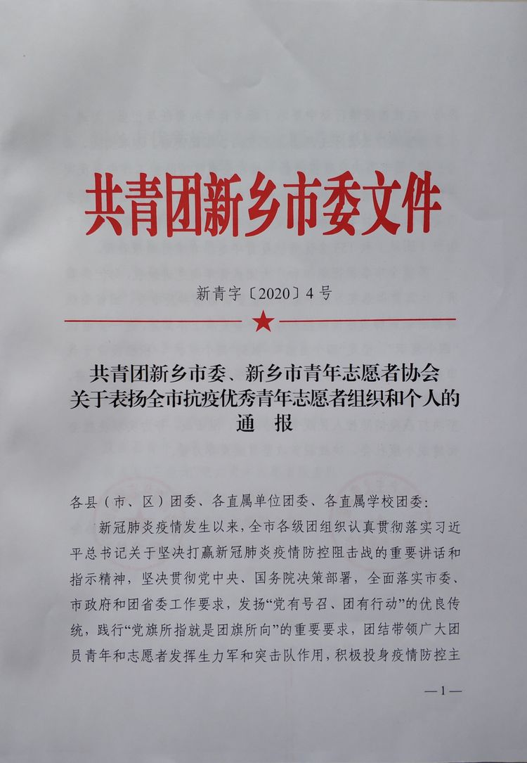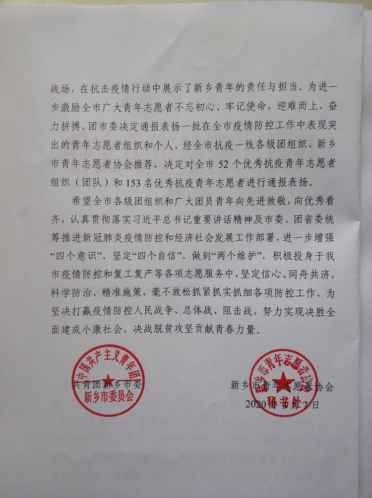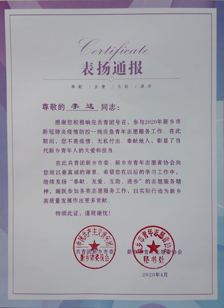 我院教师李达同志积极参与新乡市新冠肺炎疫情防控一线应急青年志愿服务工作,受到团市委及市志愿者协会联合表彰。