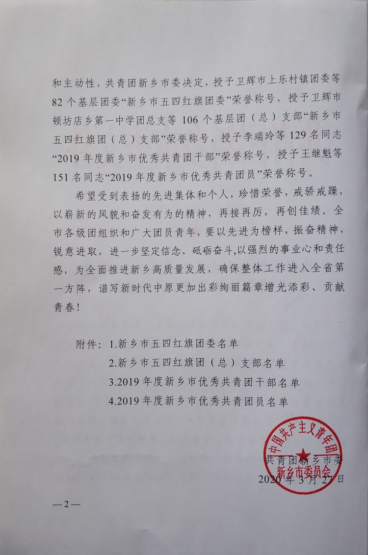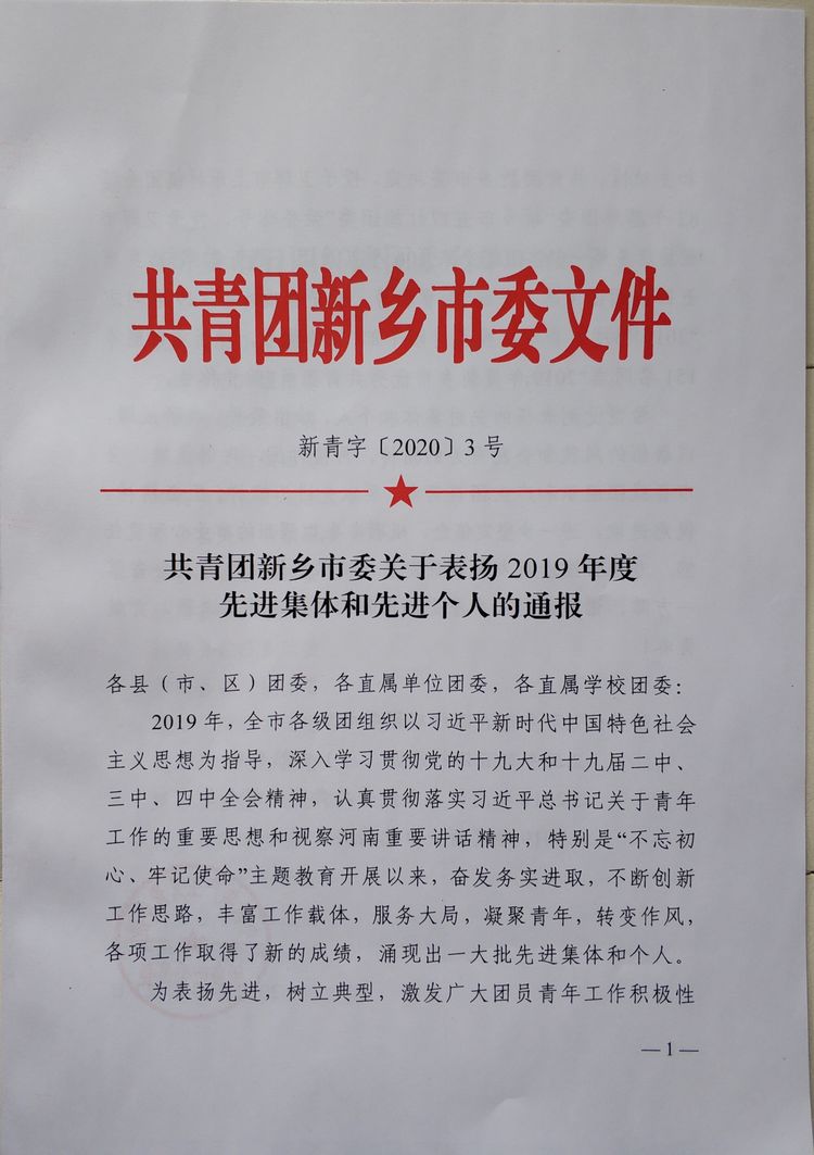 我院团委获得2019年度新乡市五四红旗团委称号,在过去的一年中,院团委多次组织“共建和谐校园,争做文明学生”、“文明创建有我”等主题活动,为学院文明创建增砖加瓦,增添助力。