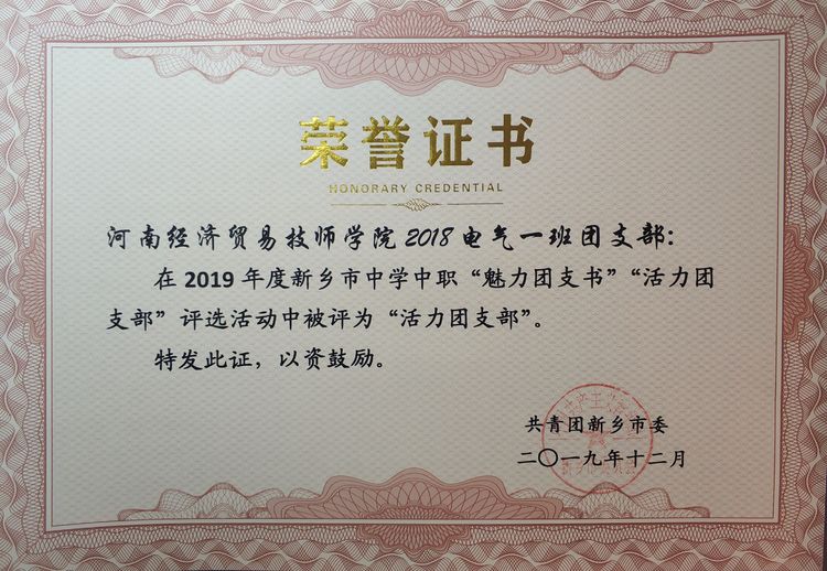 我院自动控制系18电气1班获得2019年度新乡市“活力团支部”荣誉称号。
