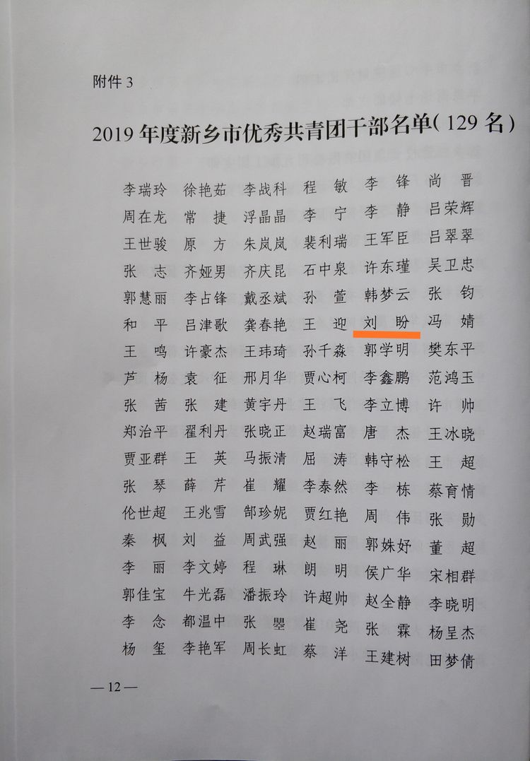 我院团委刘盼同志获2019年度新乡市优秀共青团干部称号。