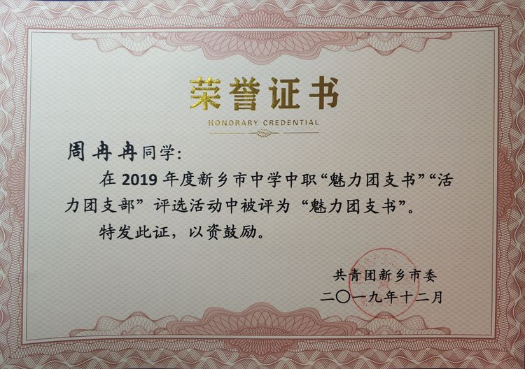 我院学生周冉冉获2019年度新乡市中学中职“魅力团支书”荣誉称号。