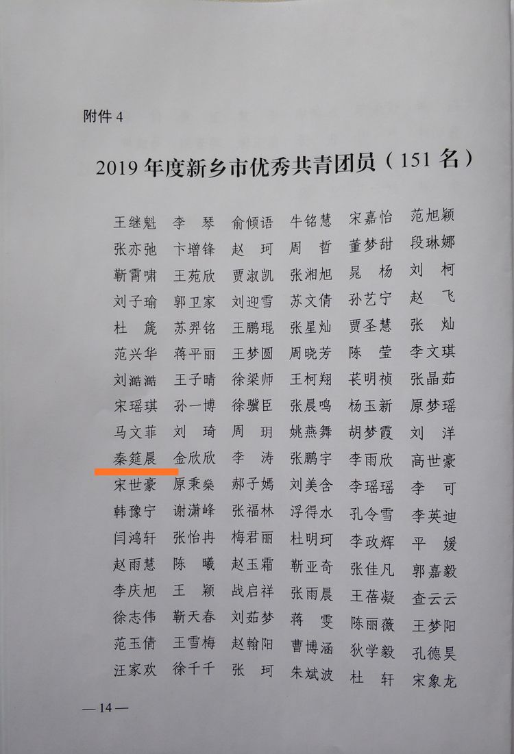 我院学生会干部秦筵晨同学获2019年度新乡市优秀共青团员称号。