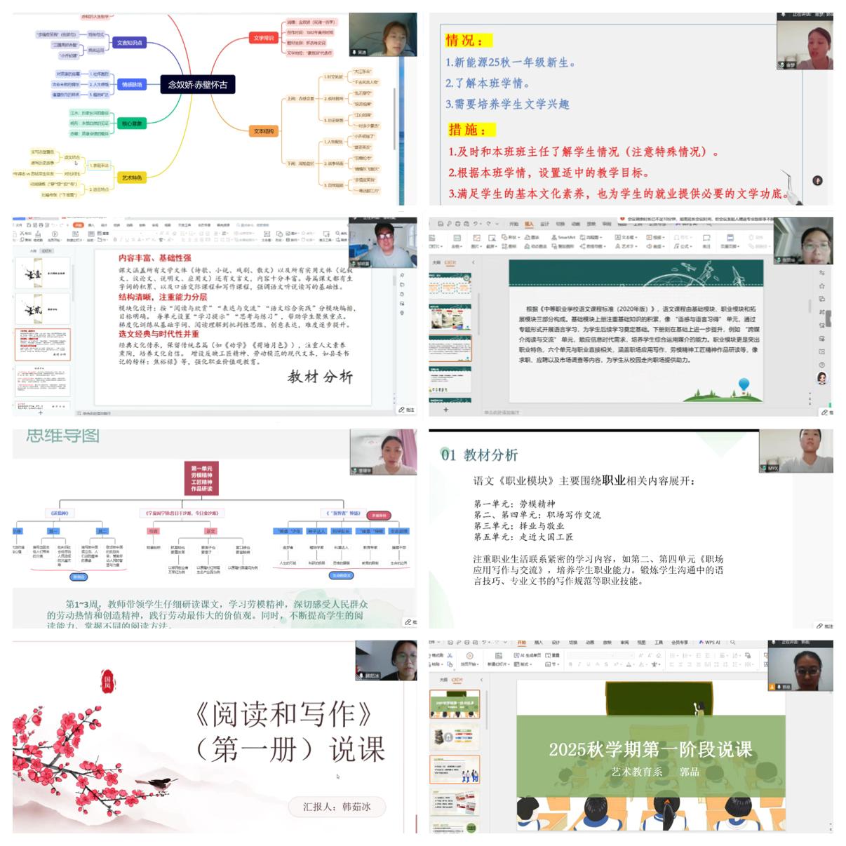 第一阶段线上说课于7月30日-31日分组进行。每位教师详细阐述本学期教学计划和课程教学思路,新开课教师还分享了精心准备的教学思维导图。云端相聚,思维碰撞,为新学期教学明确了方向。