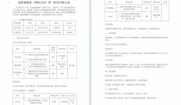 技能雏鹰班第一次考核方案。网络方向考核对标网络架构搭建、网络安全攻防等赛项,熟练运用所学知识排查网络故障、部署安全防护策略,在模拟真实网络环境中展现出扎实的网络规划与运维能力。
