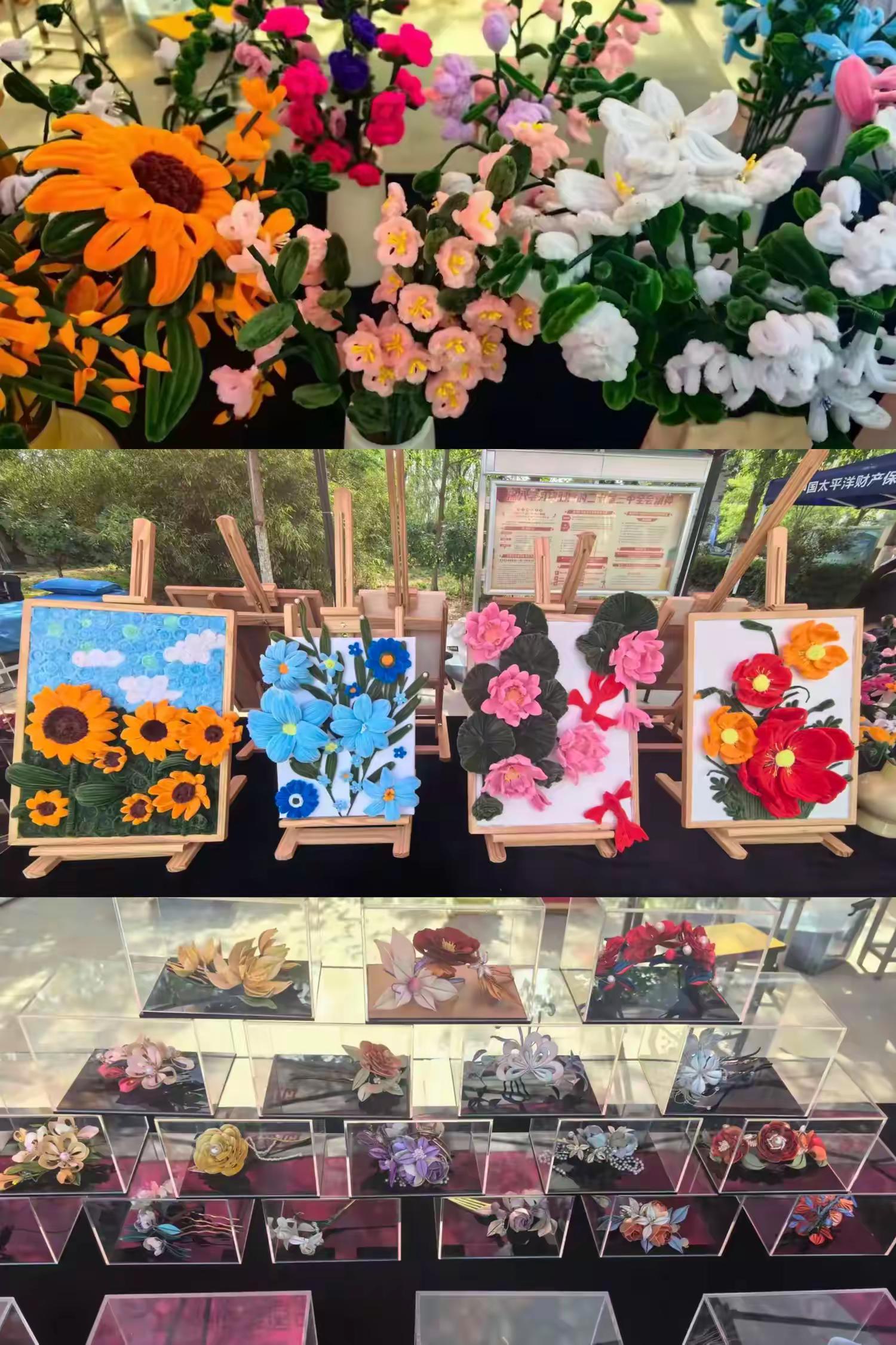 艺术教育系美术课程分为缠花、扭扭棒和互动游戏,学生通过美术课程的学习,可以具备适应幼儿园美术教育活动和幼儿园环境创设的能力,美工模块中“大转盘”游戏和学生手工制作的扭扭棒花艺作品吸引了众多观众的目光,更是使得不少参观者现场参与。