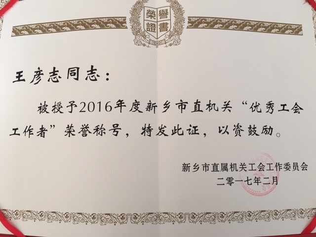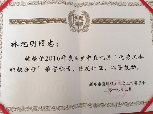 目前,我校工会被新乡市直属机关工会工作委员会授予“先进基层工会组织”。同时,我校王彦志、林旭明同志也分别被授予“优秀工会工作者”和“优秀工会积极分子”荣誉称号,受到表彰。