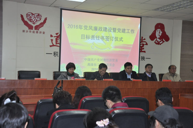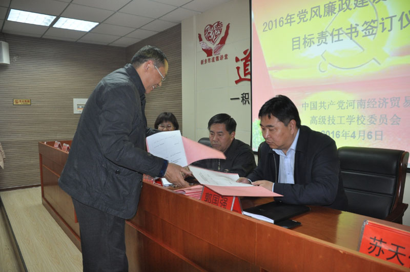 首先校党委书记任伟民同志做了讲话,他着重强调党风廉政建设的重要性,回顾了学校2015年党建工作及遵守六大纪律等情况,并对今年我校党风廉政工作及党建工作提出了要求。然后我校举行了庄重的党风廉政建设和党建工作目标管理责任书签字仪式。校长郭国强同志,党委书记任伟民同志分别与各部门负责人签订了《河南经贸高级技工学校2016年党风廉政建设和反腐败工作目标责任书》及与5个党支部书记签订了《河南经济贸易高级技工学校2016年度党建工作目标管理责任书》。目标责任书全面明了地规范了2015年我校党风廉政建设及党建工作的重点内容。最后,校长郭国强强调严明政治纪律,狠抓两个落实:一是党风廉政建设主体责任;二是严格按照党建工作要求两手抓。思想上高度重视要突出重点,从严治党,严格按规矩办事,加强督促检查,强化领导,服务大局,为推动我校各项工作落实提供坚强保证。