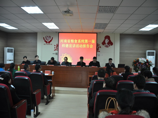 11月13日下午,河南省粮食系统第一届 “师德宣讲活动”在河南经济贸易高级技工学校举行了首场报告会。省粮食局人事教育处处长张建业、副处长崔廷良、河南工业贸易职业学院党委书记孙柏梁、副院长刘炜、河南省经济管理学校工会主席侯同江、河南经济贸易高级技工学校校长郭国强、党委书记任伟民以及校领导班子成员和全校教职工参加了本次报告会。报告会由河南经济贸易高级技工学校党委书记任伟民主持。校长郭国强同志代表河南经济贸易高级技工学校发表了热情洋溢的欢迎词。