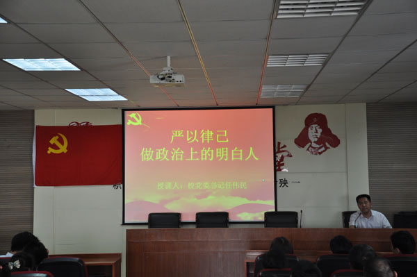 6月10日下午,我校在新教学楼多功能报告厅召开“三严三实”学习研讨专题二辅导报告会,校党委书记任伟民同志作了题为《严以律已,做政治上的明白人》的辅导报告,全体党员80余人参加了报告会,校党委副书记王成方主持报告会。