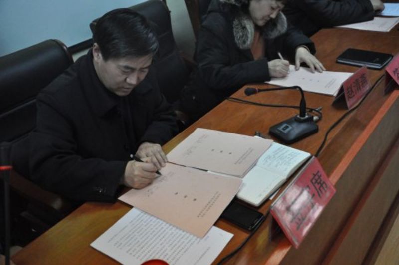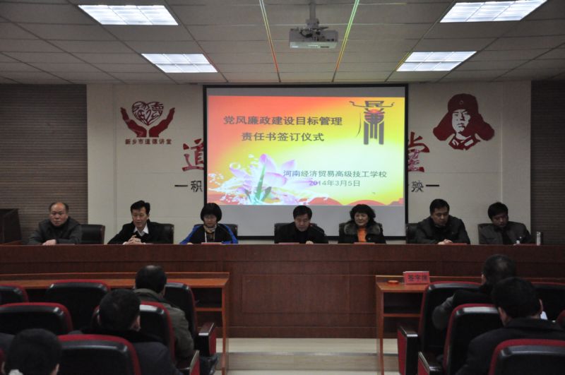 3月5日下午三点半到五点,学校党委组织全校全体中层干部和全体党员在多功能报告厅隆重举行《2014年党风廉政建设目标管理责任书》签订仪式。大会由校纪检书记王成方同志主持,校党委书记任伟民同志作了党风廉政建设动员讲话,纪检书记王成方同志带领全体人员学习了《2014年党风廉政建设目标管理责任书》内容。党委成员王成方同志、郭国强同志、苏天保同志、张志杰同志、孙宏龙同志分别在主席台上向校长赵清燕同志和校党委书记任伟民同志签订了《2014年党风廉政建设目标管理责任书》,郭国强同志和张志杰同志分别在主席台上向学校签订了《学生资助工作责任承诺书》。25个科室负责人在会场分别向分管的校领导签订了《2014年党风廉政建设目标管理责任书》,学生科、助学金办公室、招生办、教育资源开发科分别向副校长郭国强同志和工会主席张志杰同志签订了《学生资助工作责任承诺书》。会场秩序井然,全体同志深受教育。