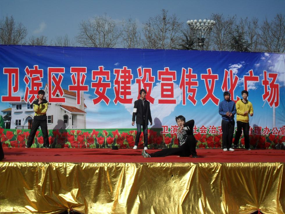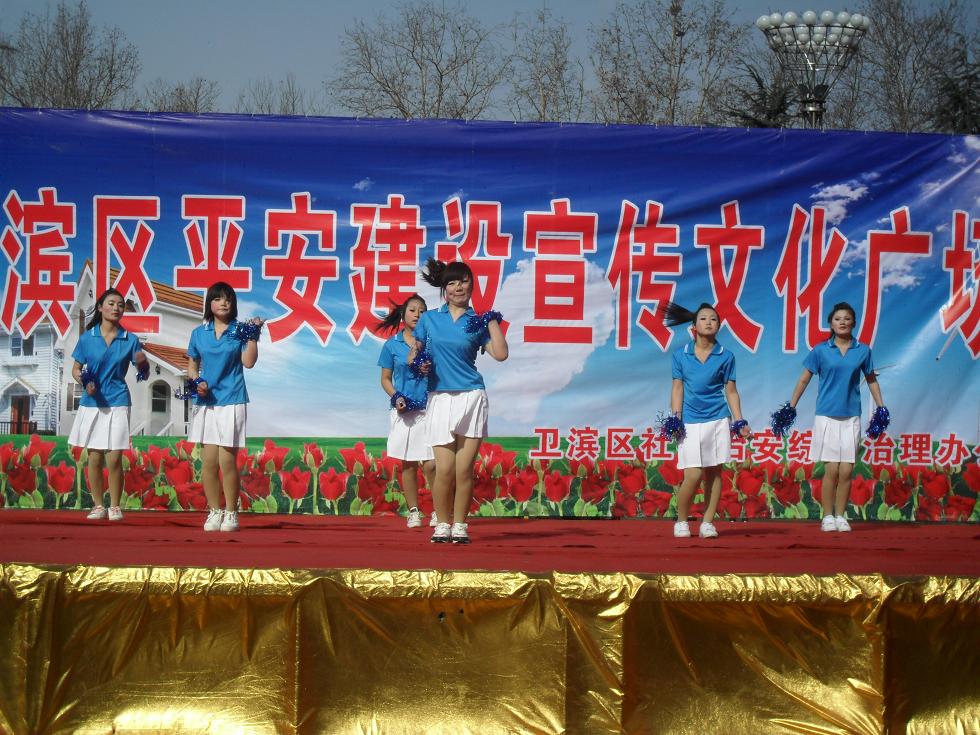 我校接到市卫滨区胜利路办事处通知后,主管校长孙宏龙同志作了认真部署和安排。保卫处、校团委积极准备,认真排练节目。今天文化广场的演出,各单位都进行了认真细致的准备,场面宏大,锣鼓喧天,彩旗招展,精彩纷呈,我校11平面班苗苗等六名同学表演了《青春美少女》拉拉舞和11高数班崔超峰等八名同学表演的街舞《Super boy》,两个演出节目节奏明快、活力十足,博得观众的阵阵掌声。