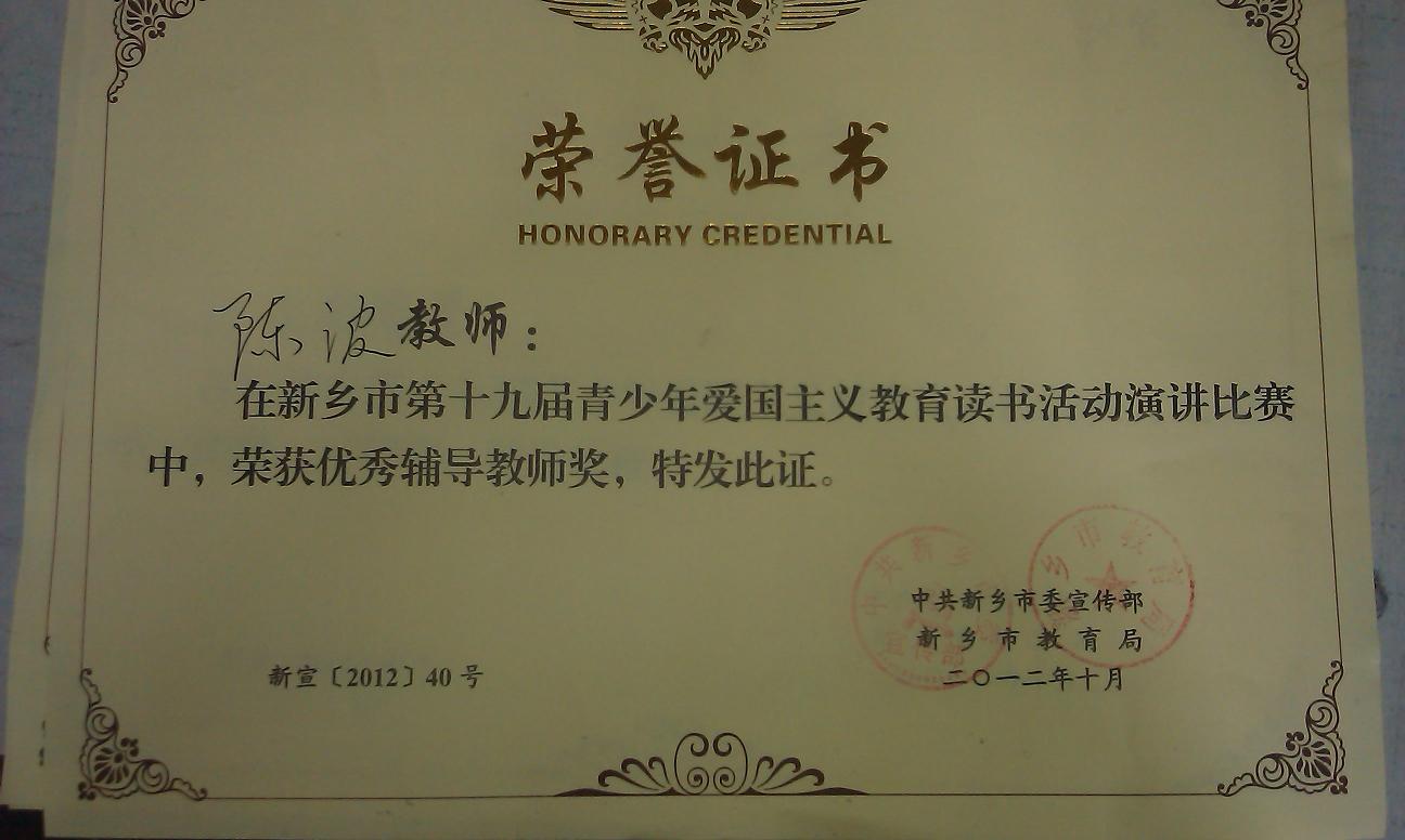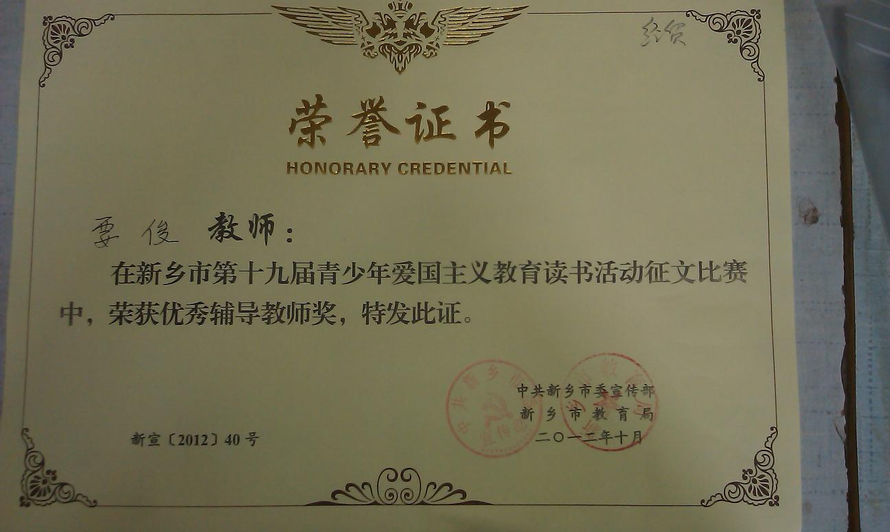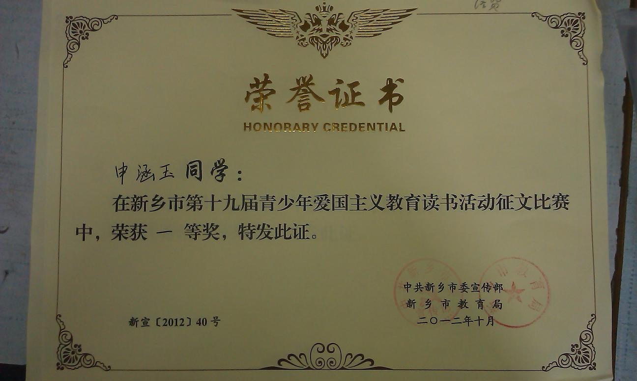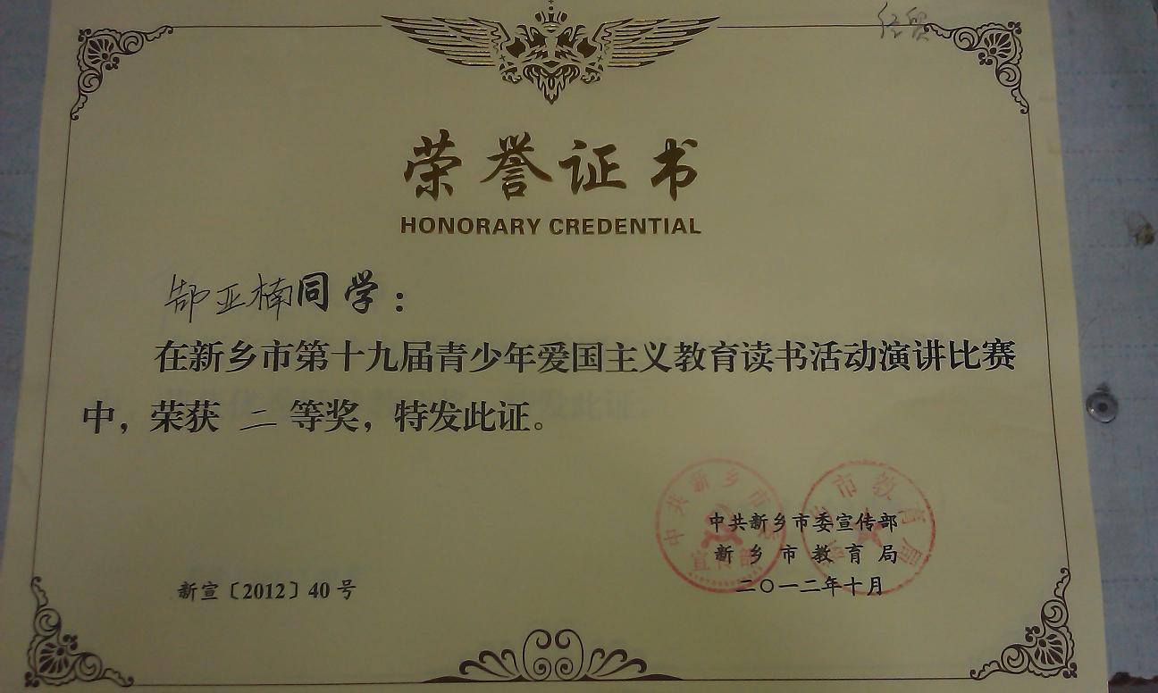 近日, 校团委在新乡市委宣传部召开的关于表彰第十九届青少年爱国主义读书活动先进单位和先进个人的会议上带回了一块奖牌和若干荣誉证书,也带回了上级领导对我校爱国主义读书活动和青少年思想道德建设工作的肯定和鼓励。
