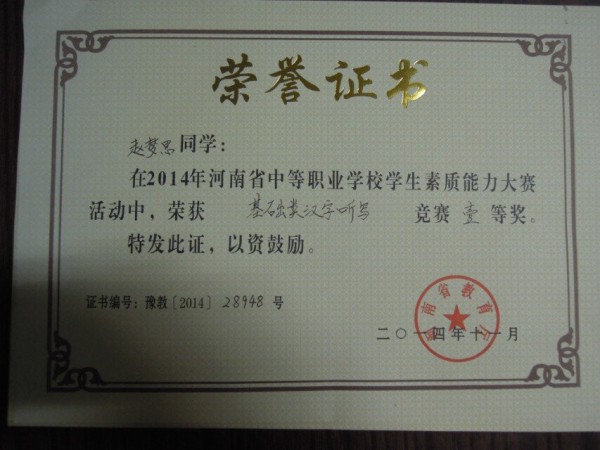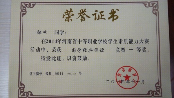 为提高教育质量,提升学生素质,我校于2014年11月1日至9日,参加了河南省中等职业学校学生素质能力大赛,共参加了五大类、15个小项的比赛,参赛学生40余名。在学校领导的关怀下,在辅导教师和参赛学生的共同努力下,我校在校园小话剧、三人篮球赛、国学经典朗诵、汉字听写等项目中20名学生荣获一等奖,6名学生荣获二等奖,12名学生荣获三等奖,同时有18名教师获辅导教师奖。