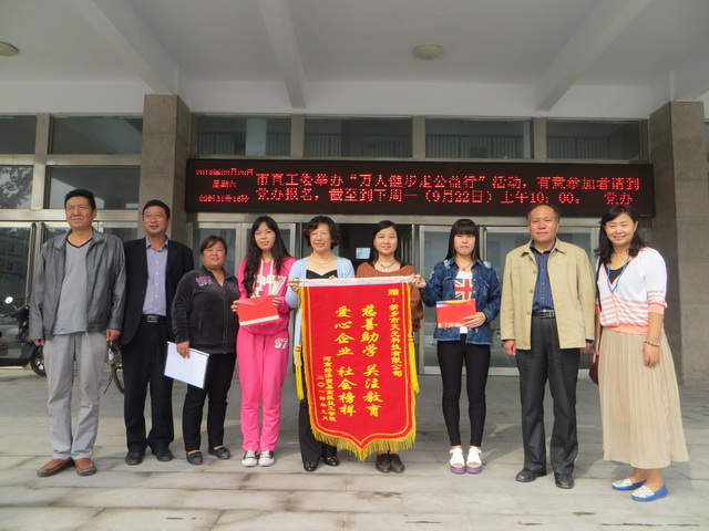 2014年9月20日上午,在我校实训楼会议室举办了庄重的企业资助困难学生上大学仪式。我校有孙宏龙副校长、教务处任全来主任、粮油食品系程相台主任参加,由就业办袁中理主任主持仪式,爱心企业新乡市天光科技有限公司人力部经理顾建群、副经理詹晓鸽亲临会场向11商外两位考上国家2本河南科技学院国际贸易专业的学生发放助学善款每人1000元。仪式上孙宏龙副校长、任全来主任、袁中理主任发表了热情洋溢的讲话,向天光科技有限公司表示了真诚的感谢,更提出了未来校企合作的新构想,对即将步入大学的两位学生提出了希望和要求,鼓励她们走好大学路,自信自强,以优异成绩回报母校和社会。两位学生也向天光科技有限公司献上了锦旗,表达了感谢和决心。
