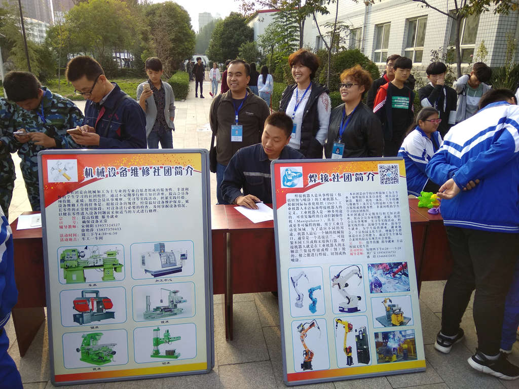 焊接社团,机械设备维修社团展示区,学生积极报名中。