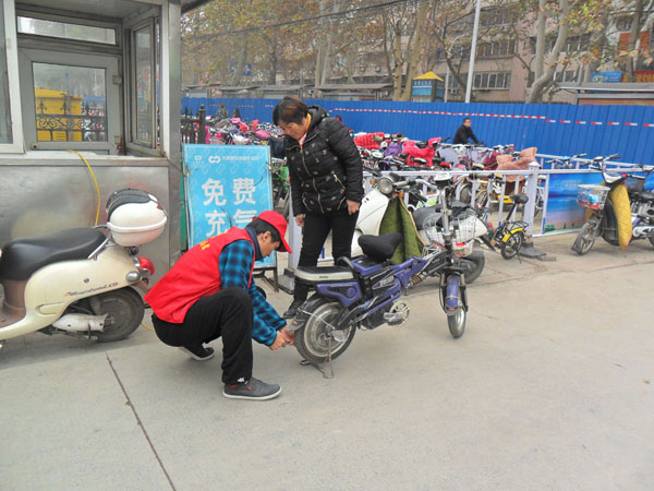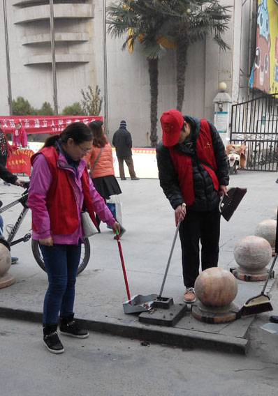 我校教工志愿者们在党办主任刘金生同志带领下按照要求从学校下午1点乘车前往指定地点,提前到岗,大家统一身着印有“新乡志愿者”的红马甲。摆放好宣传展板、宣传资料和问卷调查表,悬挂起“创建全国文明城市,建立人民满意新乡”的标语,按照分工进行活动。由于我校执勤路段是新乡市的商业中心,人多车多,执勤路段解放路施工导致交通拥堵,有的教工志愿者在拥堵路段帮助指挥交通。有的教工志愿者对路面上的果皮纸屑、烟头、树叶杂草、垃圾进行清理、对街边电线杆上的小广告进行清理。孙鸿晏老师给过往行人发放《2016年文明月历》10余份,调查问卷表10多份,向市民讲解新乡市创建文明城市的意义。李作冲老师在新玛特免费打气处帮助市民的自行车、电动车打气。慢慢地夜幕降临,六、七点钟的新乡市已经华灯初上,虽然天气较冷,但是大家都能善始善终,一致认为参加这次文明引导志愿服务活动很有意义,为创建文明城市尽了微薄之力,心里感觉暖洋洋的。