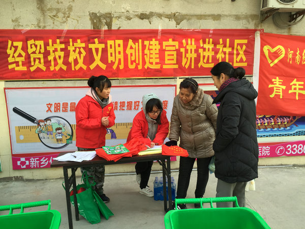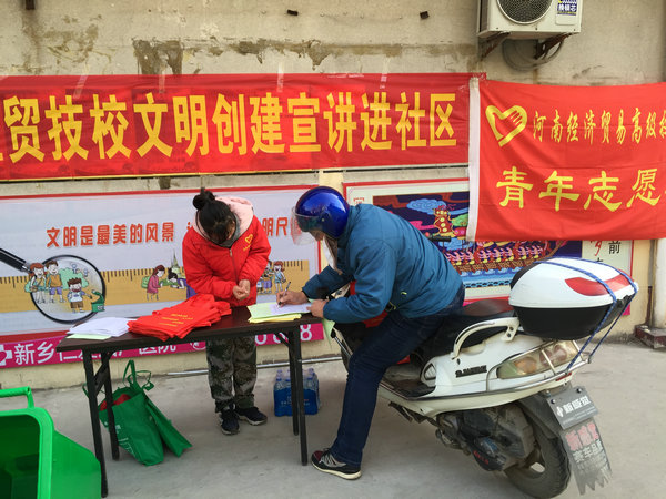 志愿者手持创建文明城市宣传手册,为社区居民普及创建文明城市的基本知识;耐心解答居民对文明创建中的一些疑惑;以及居民对帮扶工作的一些需求。