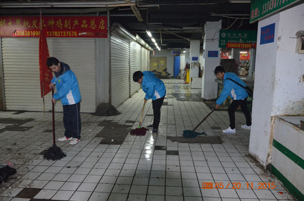 11月20日下午,我校志愿者协会10余名志愿者在机加系系书记于淼的带领下,来到新市场,开展了一次环保卫生清理大扫除,对市场内的所有卫生死角进行了一次彻底的整治。活动中,经贸志愿者们积极发挥奉献精神,不怕脏、不怕累,个个奋力争先,认真地把新市场的地面、墙面打扫干净,把长期无人清理店面的墙面、杂物等垃圾清理运走。附近一些商铺人员见状,也纷纷拿来扫帚等工具,帮助我校志愿者配合清扫,自觉加入整治环境的行列中,用行动为新市场的清洁出了一份力。除此之外,我校还为新市场购置了垃圾桶20个、防滑垫50米、簸箕20个、扫帚20个、扫把、拖把30个,总计3400元。