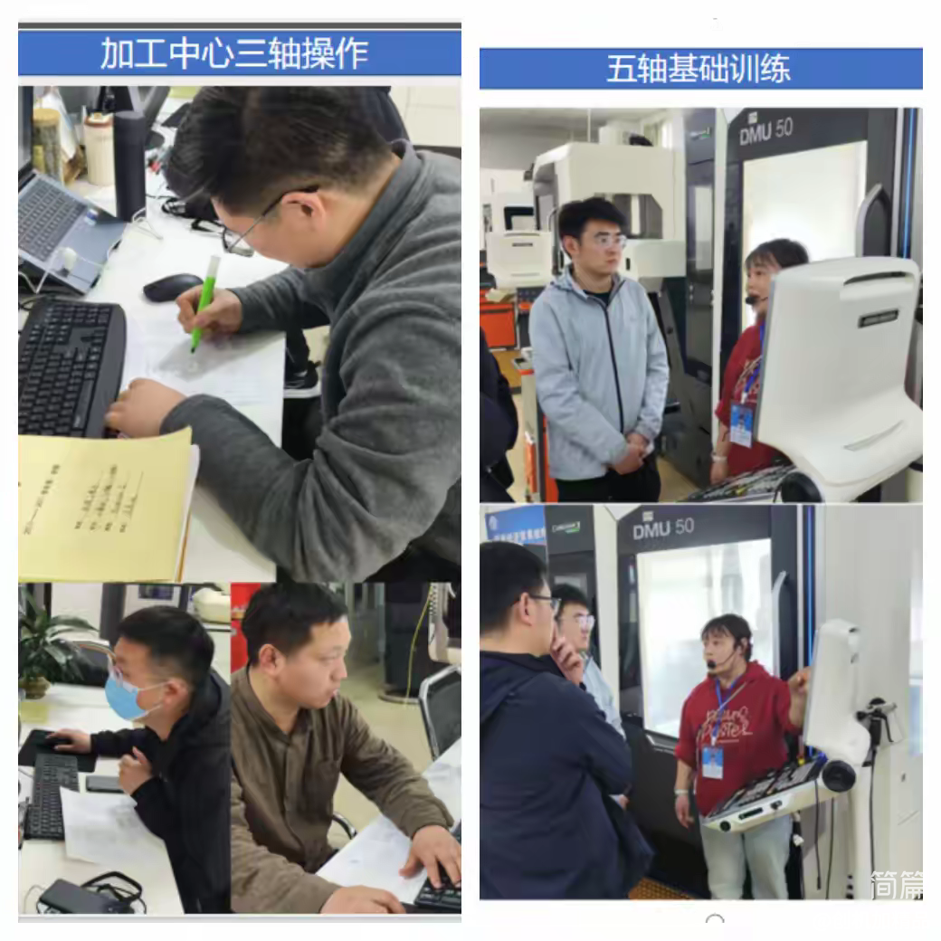 第一个方向是学习“加工中心三轴机床的编程和加工”,每月完成1件作品。第二个方向技能提升是“五轴基础训练”,提升负责人李娟娟老师,主要负责制定五轴学习计划,每位老师每月完成一件五轴手工编程件,通过加工零件快速熟悉机床基本操作。