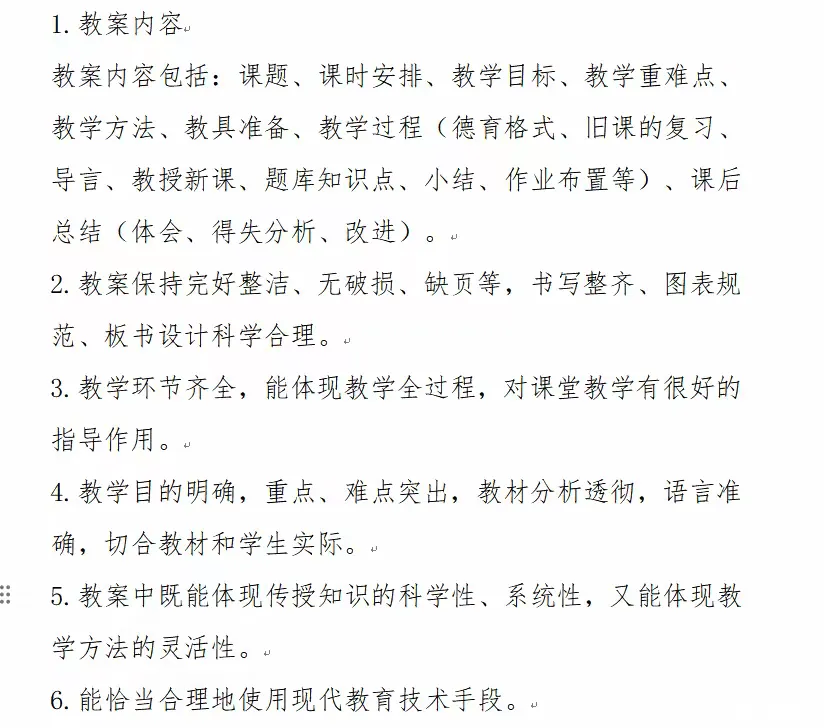 本次活动对教案编写提出明确规范要求。内容上需涵盖课题、课时安排、教学目标、重难点、教学方法、教具准备、教学过程(含德育融入、旧课复习、新课讲授、题库知识点、小结、作业布置等环节)及课后总结(含体会、得失分析与改进方向)。