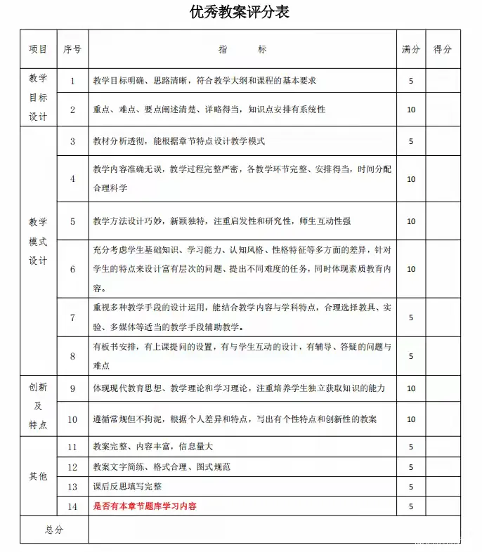 评选过程中,《优秀教案评分表》从教学目标设计(含目标明确性、重难点阐述)、教学模式设计(含教材分析、教学过程完整性、方法创新性)、创新特点及其他(含教案完整性、文字规范、课后反思、题库内容等)14 个维度进行量化评分,总分 100 分,确保评选结果客观公正。同时,《一体化教学评比标准》也为教学过程的科学性提供参考,从课程准备、教学过程、学生主体参与等多方面综合考量。
