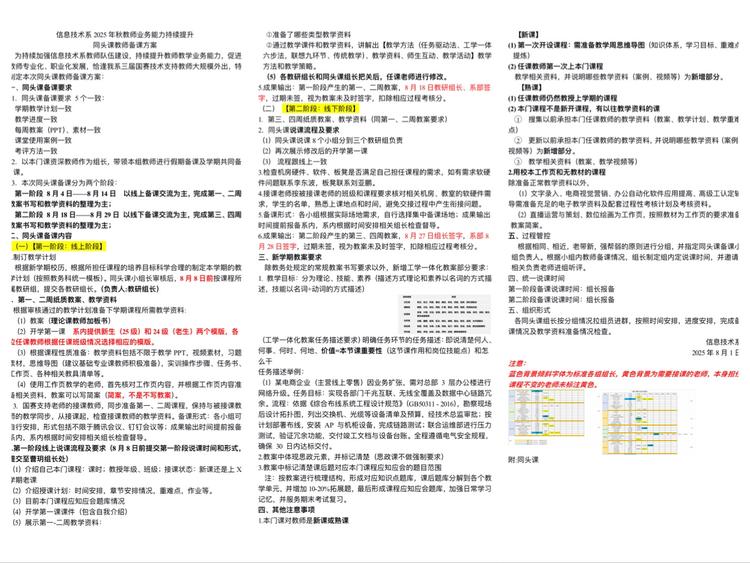 信息技术系为提升教师教学能力,结合国赛特殊情况,制定同头课备课方案:要求课程在计划、进度、教案(含PPT及素材)、案例、考评五个维度统一,由资深教师带组分两阶段推进——开学前线上研讨完成第一、二周备课,8月18-29日线下集中打磨第三、四周内容,实现质量把控。