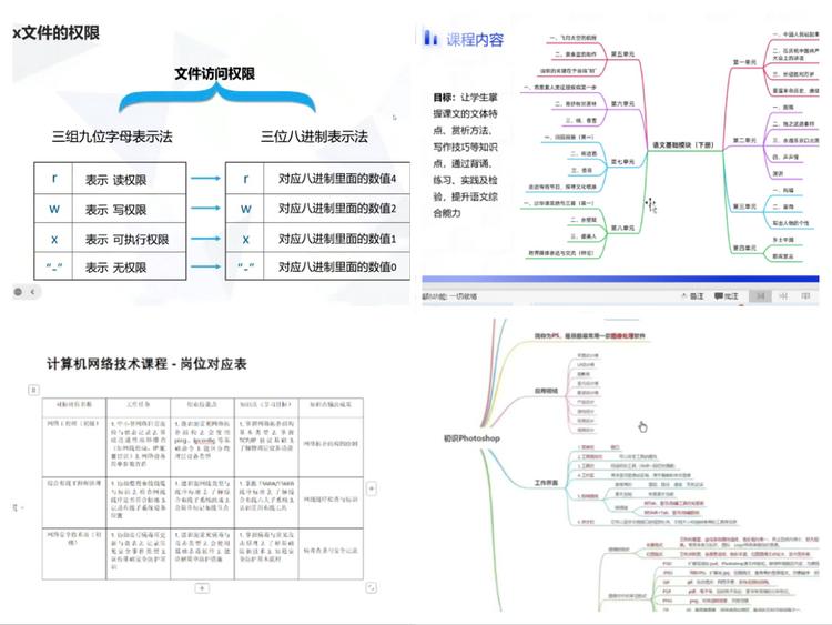 曹玥、艾斌、刘金玉等教师对标岗位需求提炼课程核心技能点,将课本每个单元设计出目标明确的思维导图。