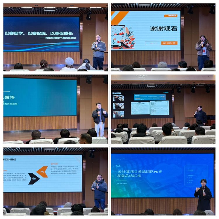 计算机网络应用专业组的技能成果展示,为大家带来一场硬核技术的深度复盘。备赛期间,新老教练团队携手研习省赛技术规程,在一次次磨课研技中沉淀实战经验。首先播放了记录省赛教练技能PK全流程vlog,生动还原了赛场的燃动瞬间。随后,他们围绕信息网络布线、移动应用开发、网络安全、云计算四大赛项逐一复盘展示,最终为每个赛项评选出表现最佳的教师,用扎实的技术功底诠释了职教人“以赛促教、以技赋能”的硬核实力。