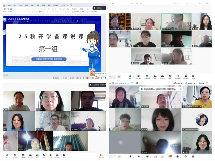 暑假期间,信息技术系依托腾讯会议平台分组开展线上说课展示。每位教师围绕课程目标、教学设计、重难点突破及信息化教学手段运用等维度进行说课,并同步共享课件资源。